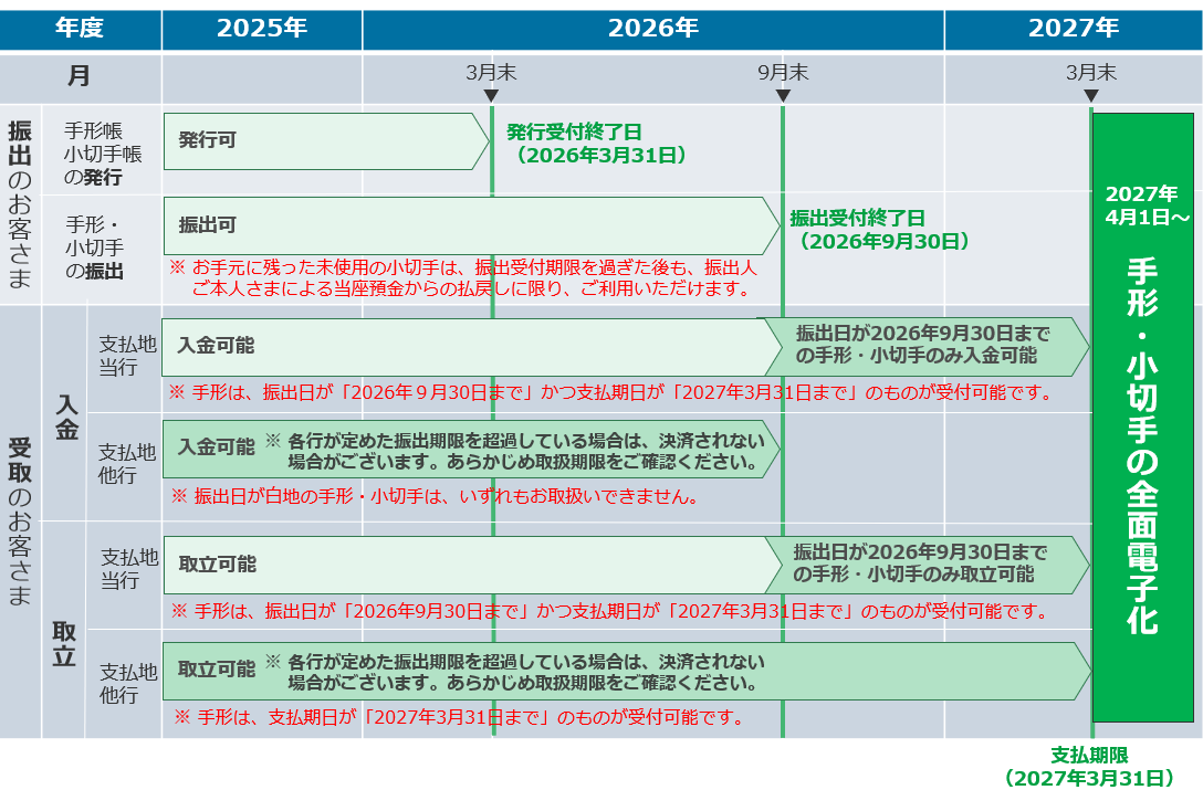 お知らせ 2026.03.30 手形・小切手の全面的な電子化に向けた各種取扱の対応について 日頃より当行をご利用いただき誠にありがとうございます。 当行は、「手形・小切手の全面的な電子化」に向けた取り組みの一環として、下記の対応を実施しますのでお知らせいたします。 手形・小切手をご利用のお客さまにおかれましては、電子記録債権<でんさい>やインターネットバンキング等への移行を進めていただきますようお願い申し上げます。 記 手形・小切手の電子化に向けた対応 手形・小切手の振出 振出受付終了日 2026年9月30日(水) お手元の未使用小切手は、振出受付期限を過ぎた後も、振出人ご本人さまによる当座預金からの払戻しに限り、そのままご利用いただけます。 手形の振出については、支払期日が「2027年3月31日まで」のものが受付可能です。 手形・小切手の入金 当行を支払地とする入金受付終了日 2027年3月31日(水) 【振出日が2026年9月30日(水)までのもの】 手形は、支払期日が「2027年3月31日まで」のものが受付可能です。 他行を支払地とする入金受付終了日 2026年9月30日(水) 振出日が白地の手形・小切手は、ともに受けつけられません。 各行が定めた振出期限を超過している場合は、決済されない場合がございます。あらかじめ取扱期限をご確認ください。 手形・小切手の取立 当行を支払地とする取立受付終了日 2027年3月31日(水) 【振出日が2026年9月30日(水)までのもの】 手形は、支払期日が「2027年3月31日まで」のものが受付可能です。 他行を支払地とする取立受付終了日 2027年3月31日(水) 手形は、支払期日が「2027年3月31日まで」のものが受付可能です。 各行が定めた振出期限を超過している場合は、決済されない場合がございます。あらかじめ取扱期限をご確認ください。 商業手形割引 最終実行期限 2026年9月30日(水) でんさいをご契約いただいているお客さまにつきましては、「でんさい割引」がご利用いただけます。 対応スケジュールについて その他 詳細につきましては、お取引店またはお近くの営業店窓口までお問い合わせください。 以 上 PDF版はこちら 株式会社 高知銀行 高知県高知市堺町2番24号