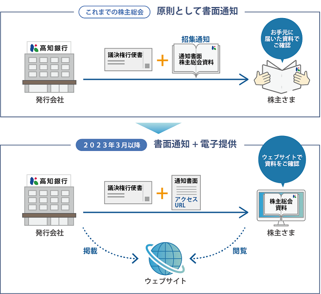 2023年3月以降開催の株主総会では、通知書面をもとにウェブサイトへアクセスすることで、株主総会資料を閲覧のうえご確認いただくこととなります。