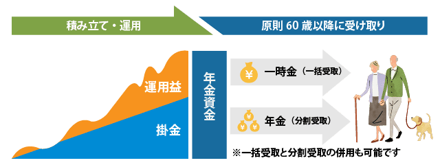 iDeCo(個人型確定拠出年金)とは、公的年金を補完してゆとりある老後に備えるために、自分で決めた額を積み立て、運用し、原則60歳以降に受け取る仕組みの私的年金制度です。