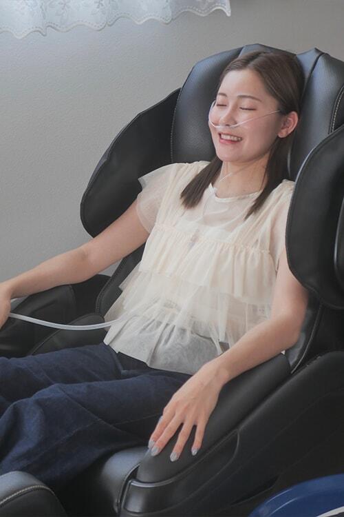 入酵後は、シャワー室で米ぬかを落としてバスローブに着替え、2階にあるリラックスルームのリクライニングチェアに座って二次発汗タイム。水素水で水分補給をしながら、さらに体を整えます。