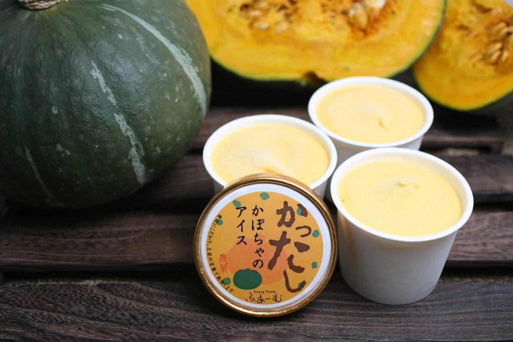 "かぼちゃのアイス"には、「安芸グループふぁーむ」の農家さんたちがハウス栽培で育てたかぼちゃを使用!濃厚な甘みと滑らかな口あたりがクセになる味わいです。高知県産のお茶を使った"お茶のアイス"や、室戸市で養殖したスジアオノリ使用の"青のりの香るアイス"など、バラエティ豊かなラインナップで老若男女に愛されています。